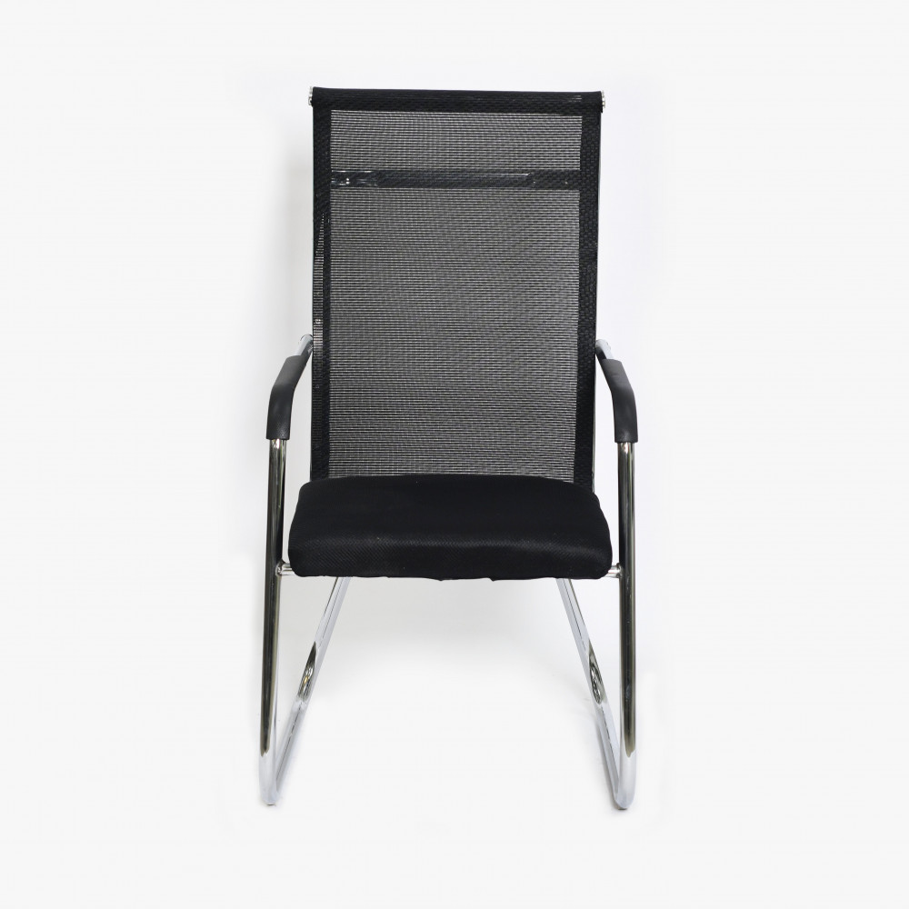 كرسي ثابت بظهر من الشبك ومقعدة من القماش وقواعد من الستيل وبيد مغطاة من البلاستيك